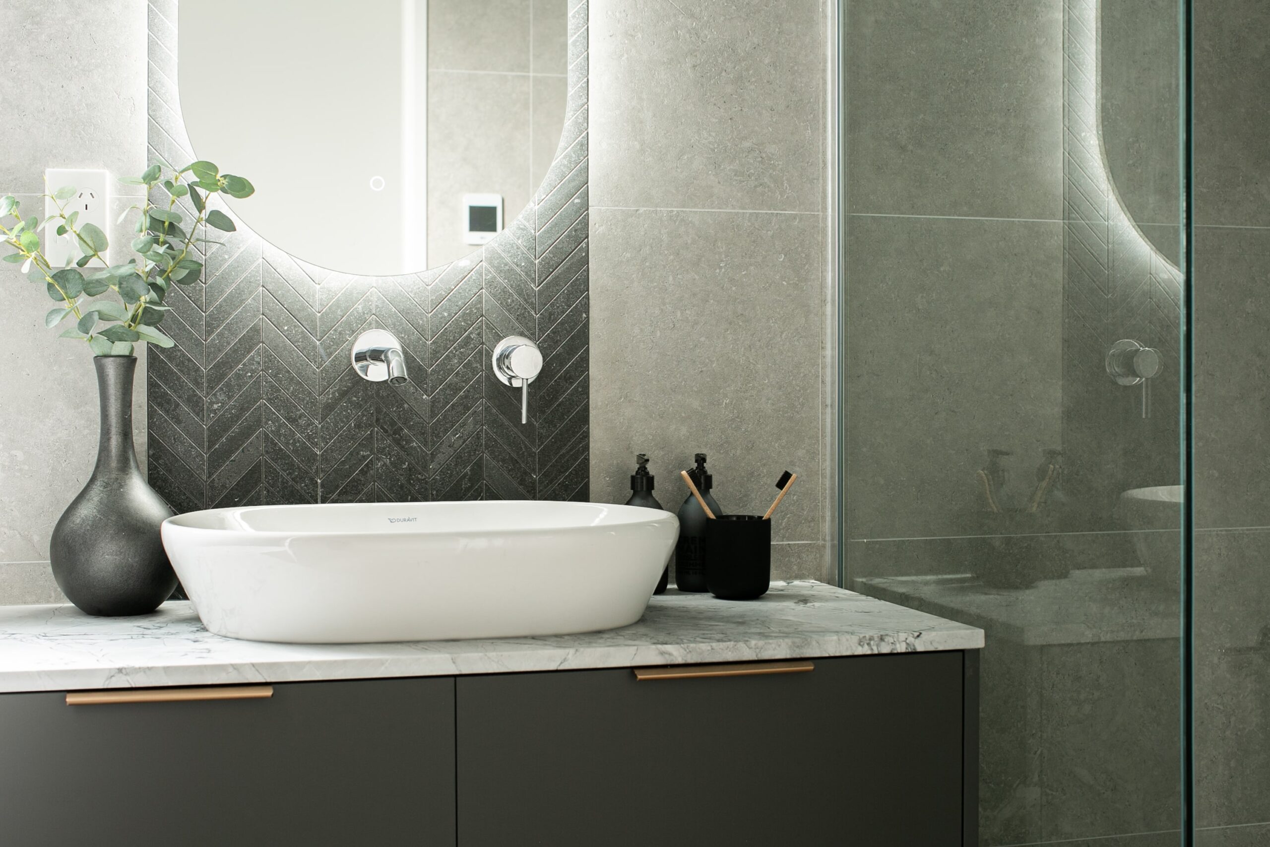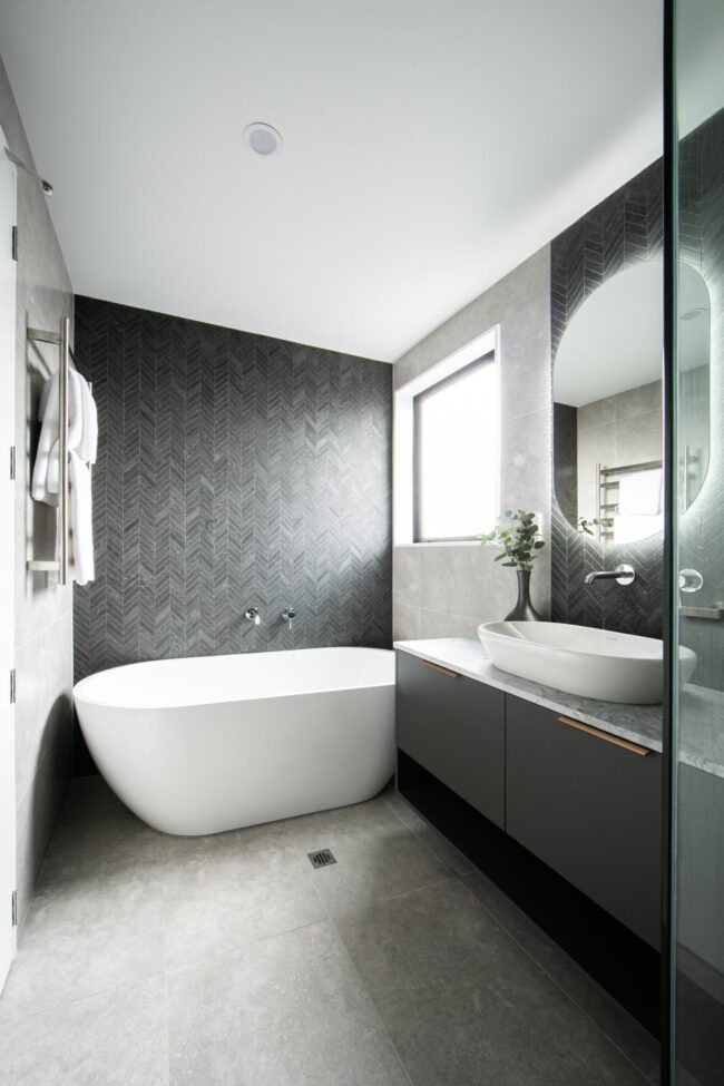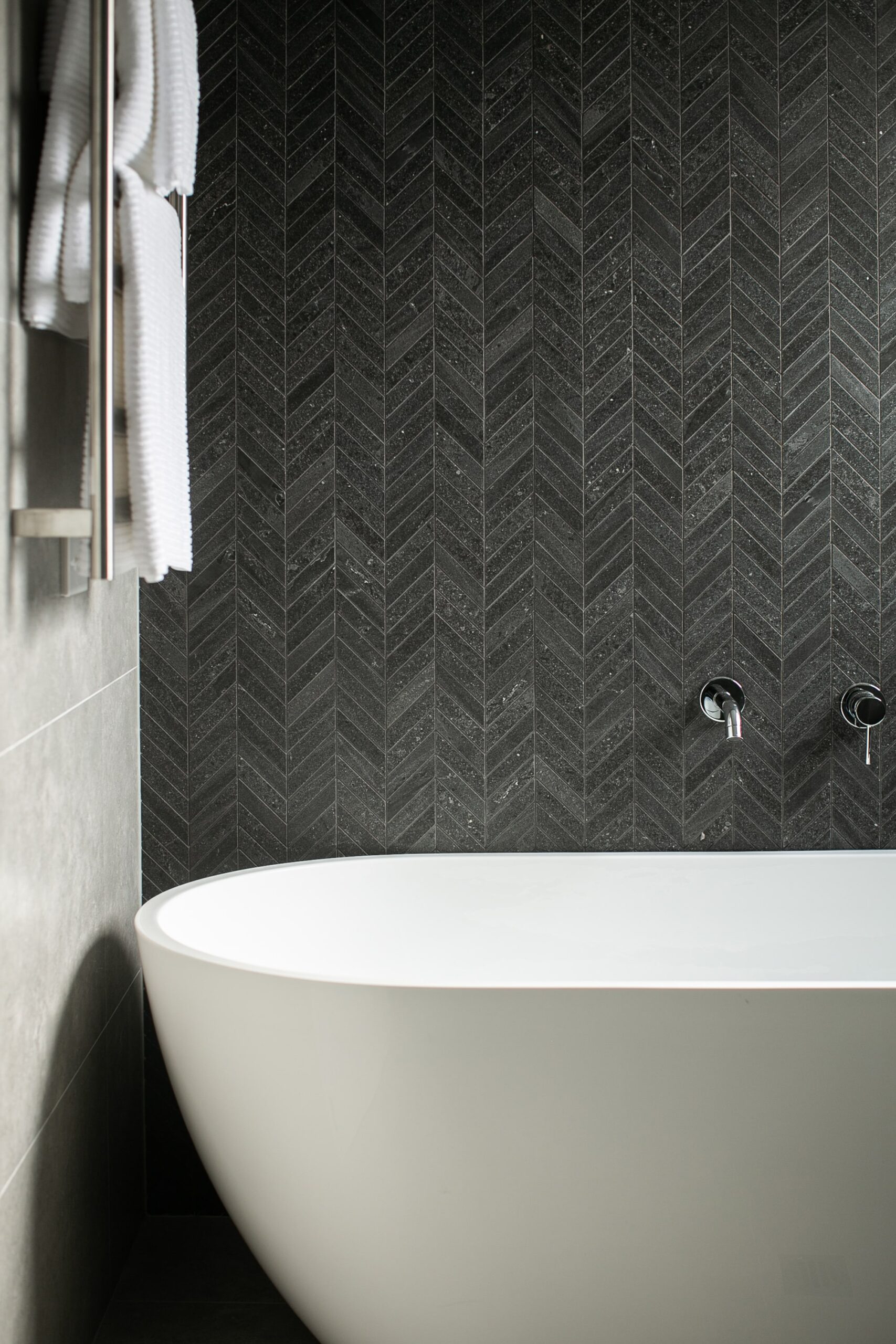 This bathroom is designed as a space of quiet indulgence, where sleek modern lines meet a touch of dramatic contrast. The overall palette is calm and refined, anchored by large-format grey tiles that set a soft, understated tone. Against this backdrop, the feature wall becomes a focal point—its dark chevron tile pattern adding depth, movement, and a subtle sense of luxury to the room.