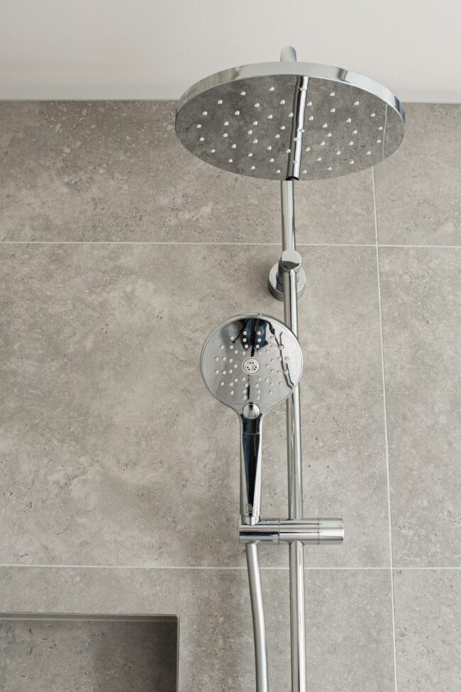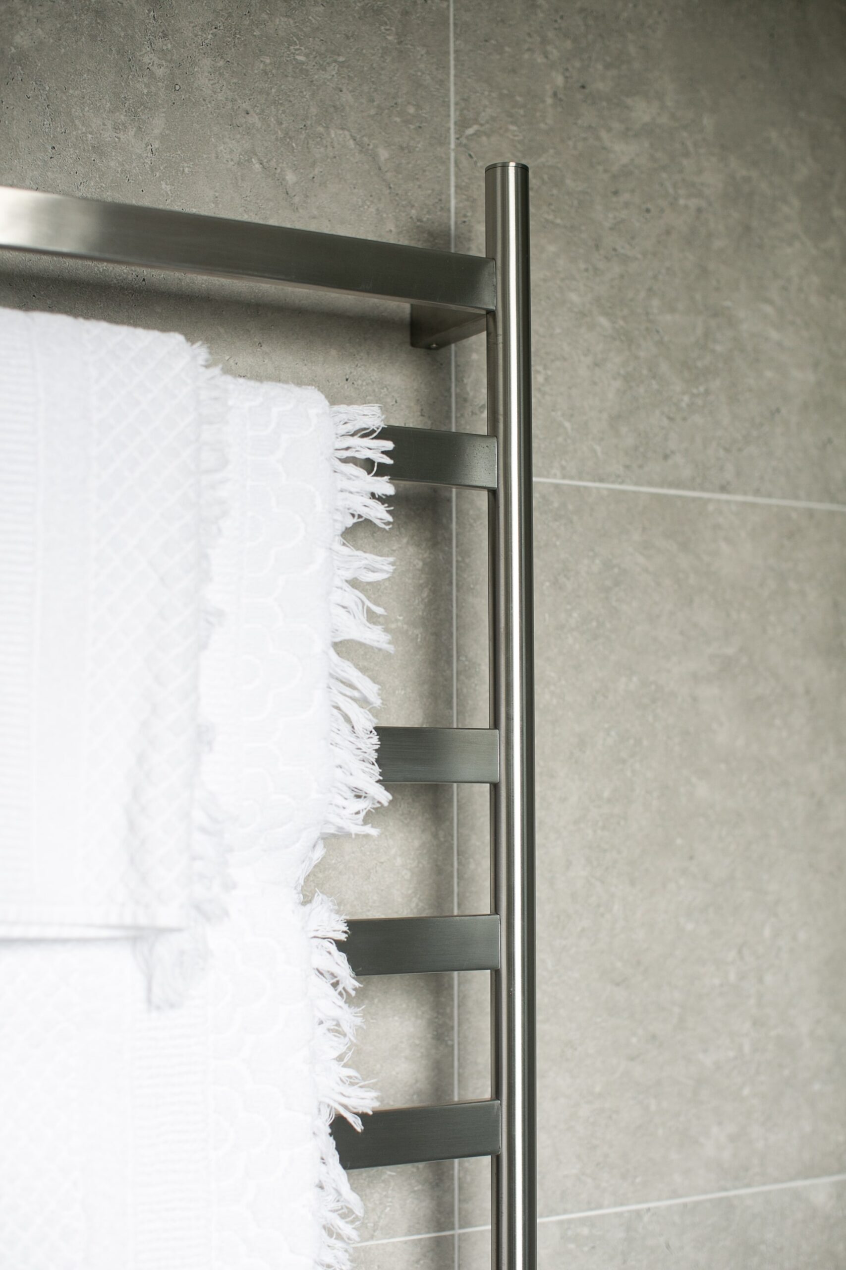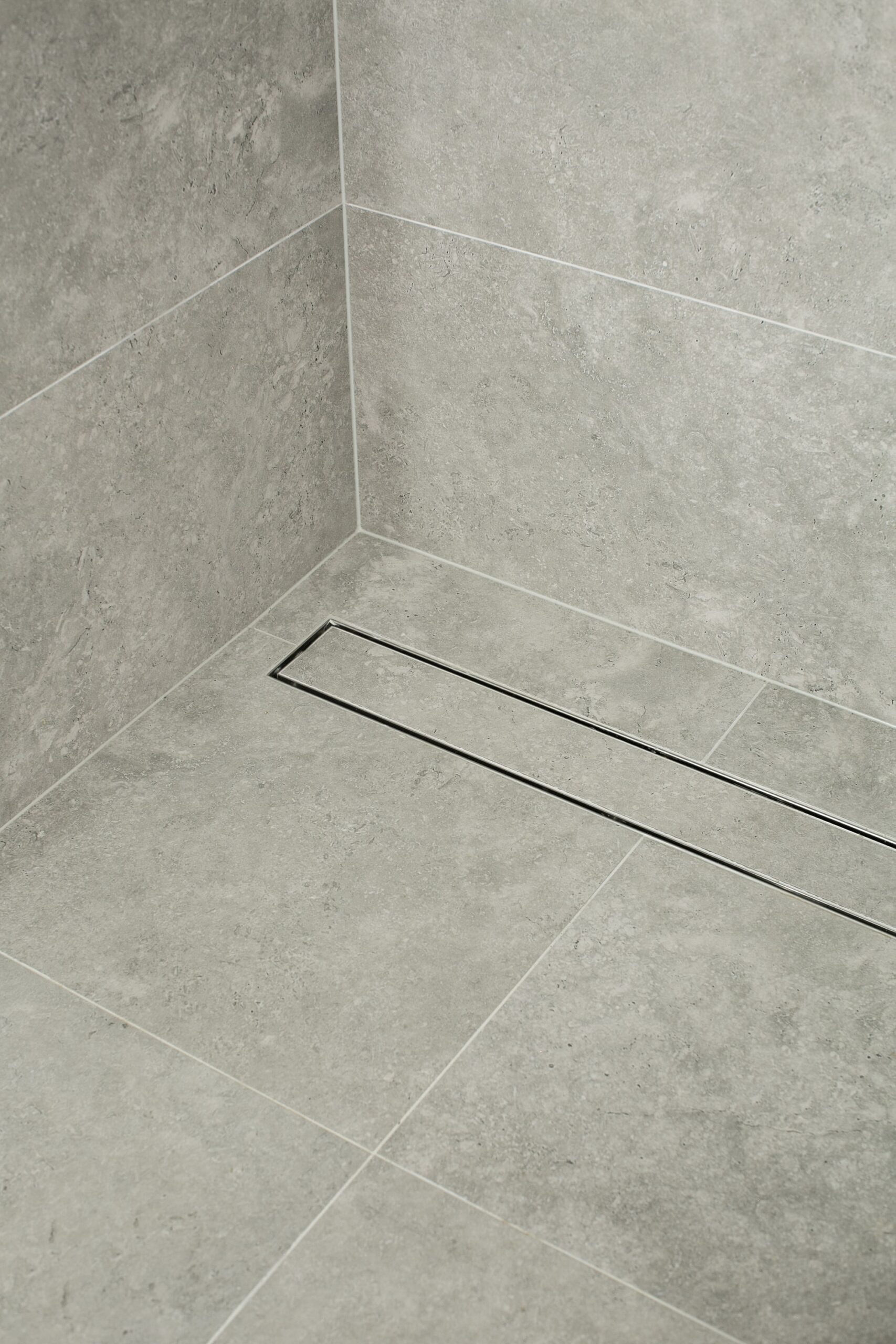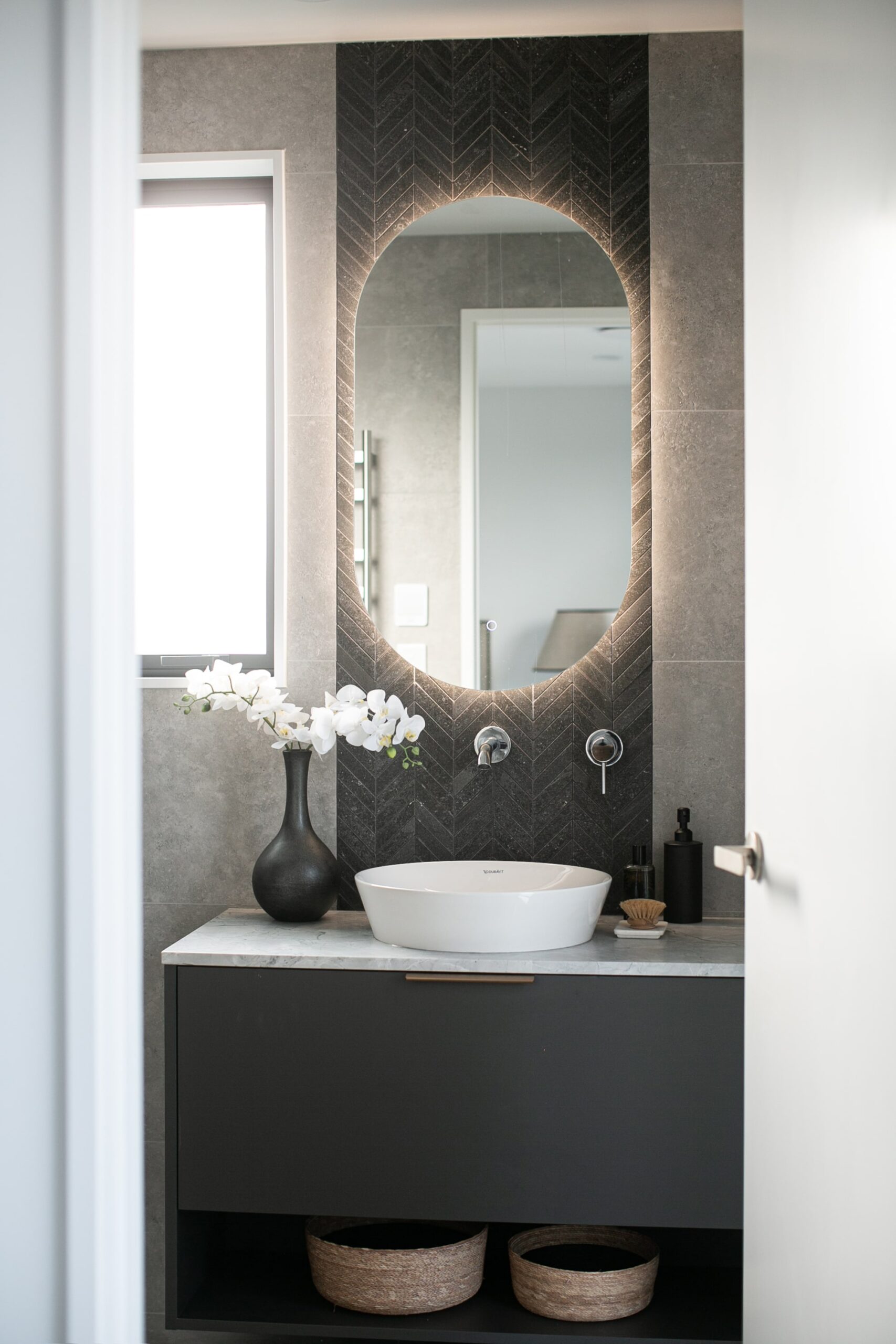 This bathroom is designed as a space of quiet indulgence, where sleek modern lines meet a touch of dramatic contrast. The overall palette is calm and refined, anchored by large-format grey tiles that set a soft, understated tone. Against this backdrop, the feature wall becomes a focal point—its dark chevron tile pattern adding depth, movement, and a subtle sense of luxury to the room.