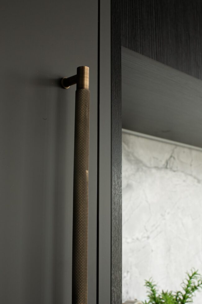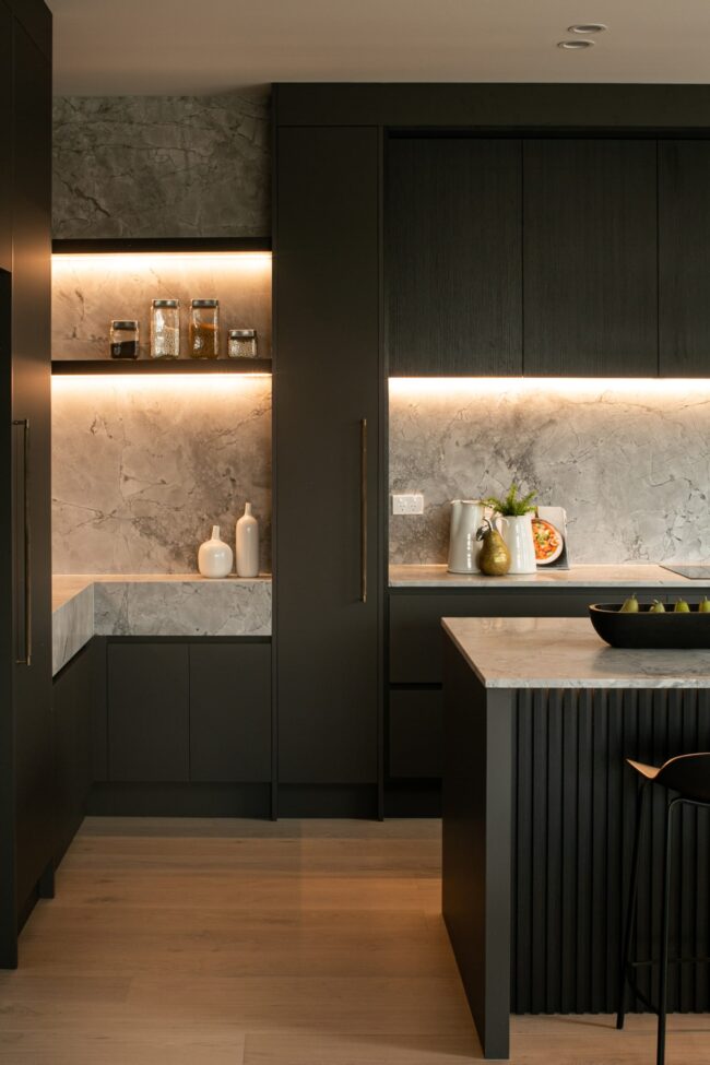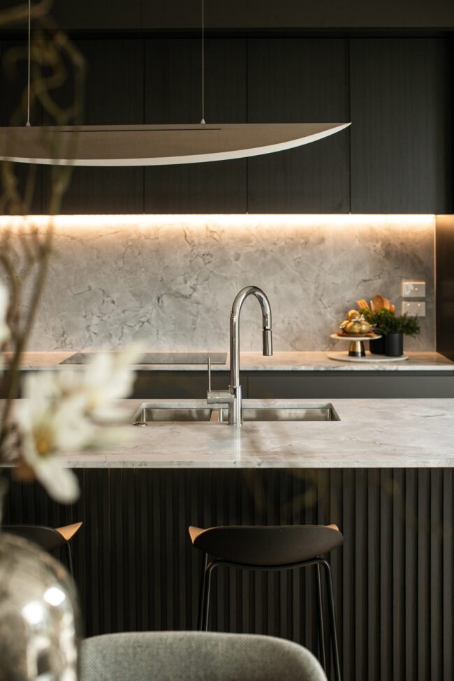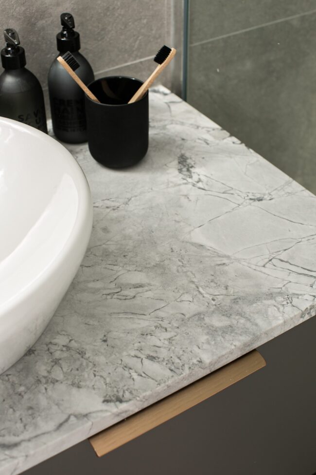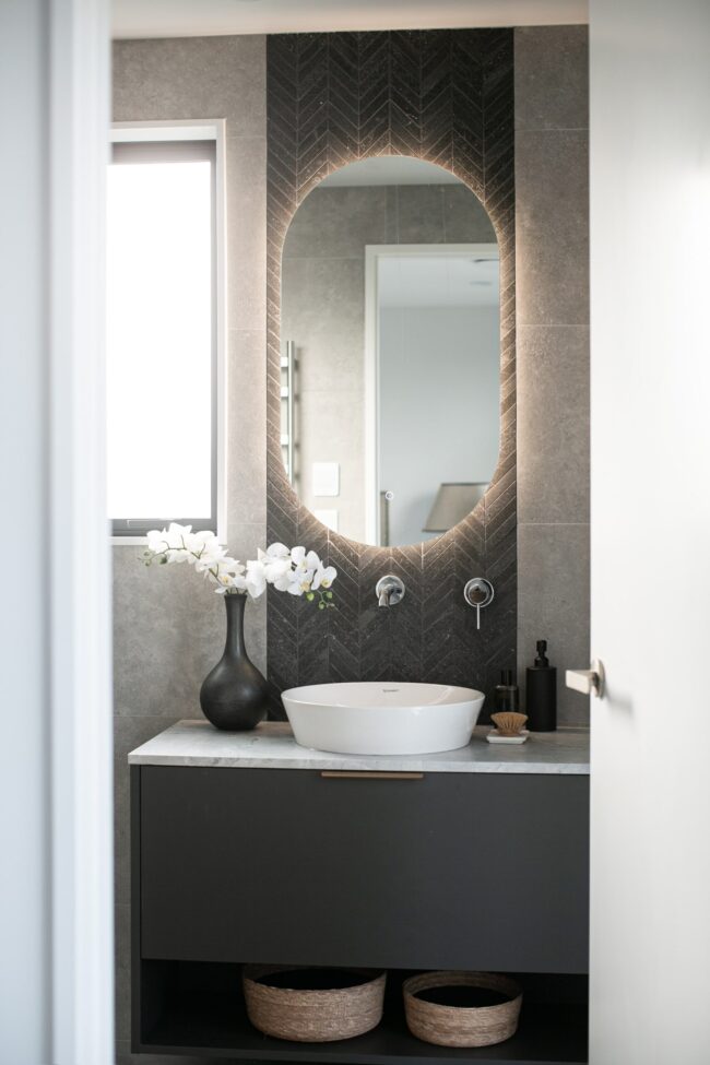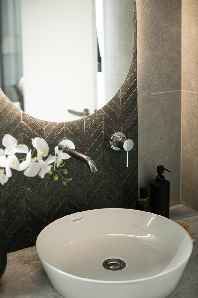 The freestanding bath takes centre stage, sculptural in its simplicity. Positioned beneath the feature wall, it feels like a statement piece—inviting moments of pause and relaxation. The floating vanity continues the clean-lined approach, finished in a matte graphite tone and topped with marble. A vessel basin sits gracefully on top, paired with sleek wall-mounted tapware, blending contemporary functionality with refined elegance.