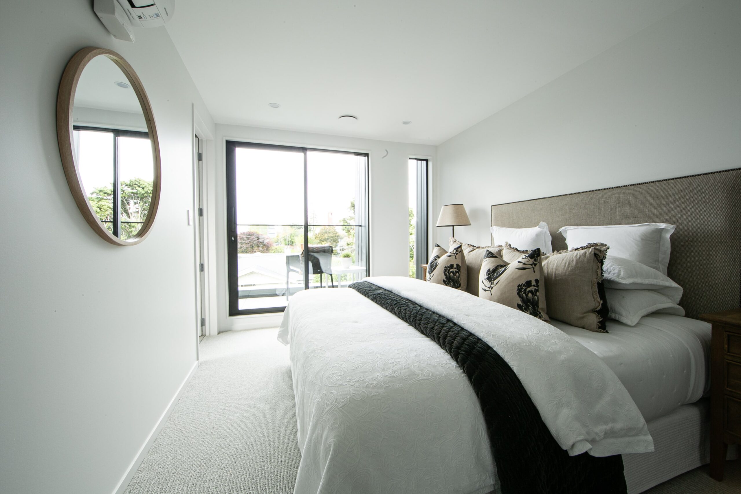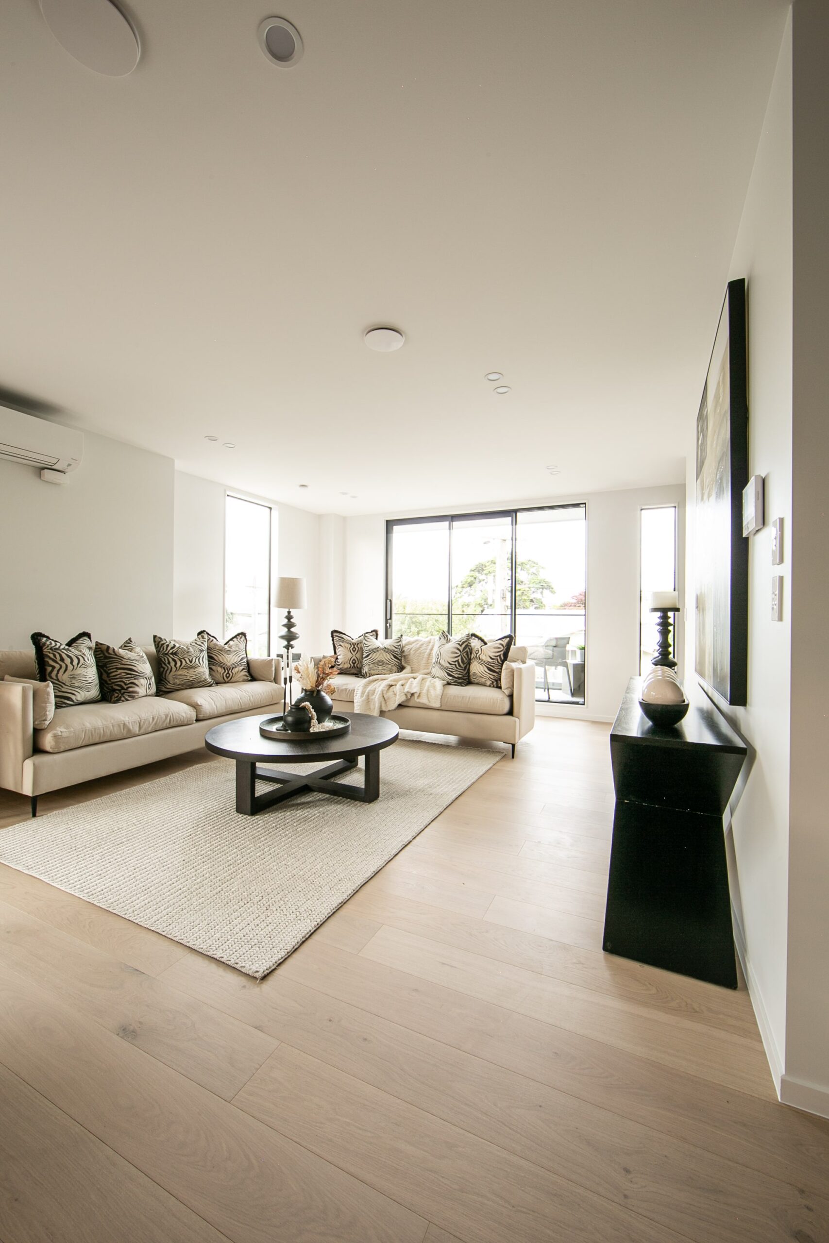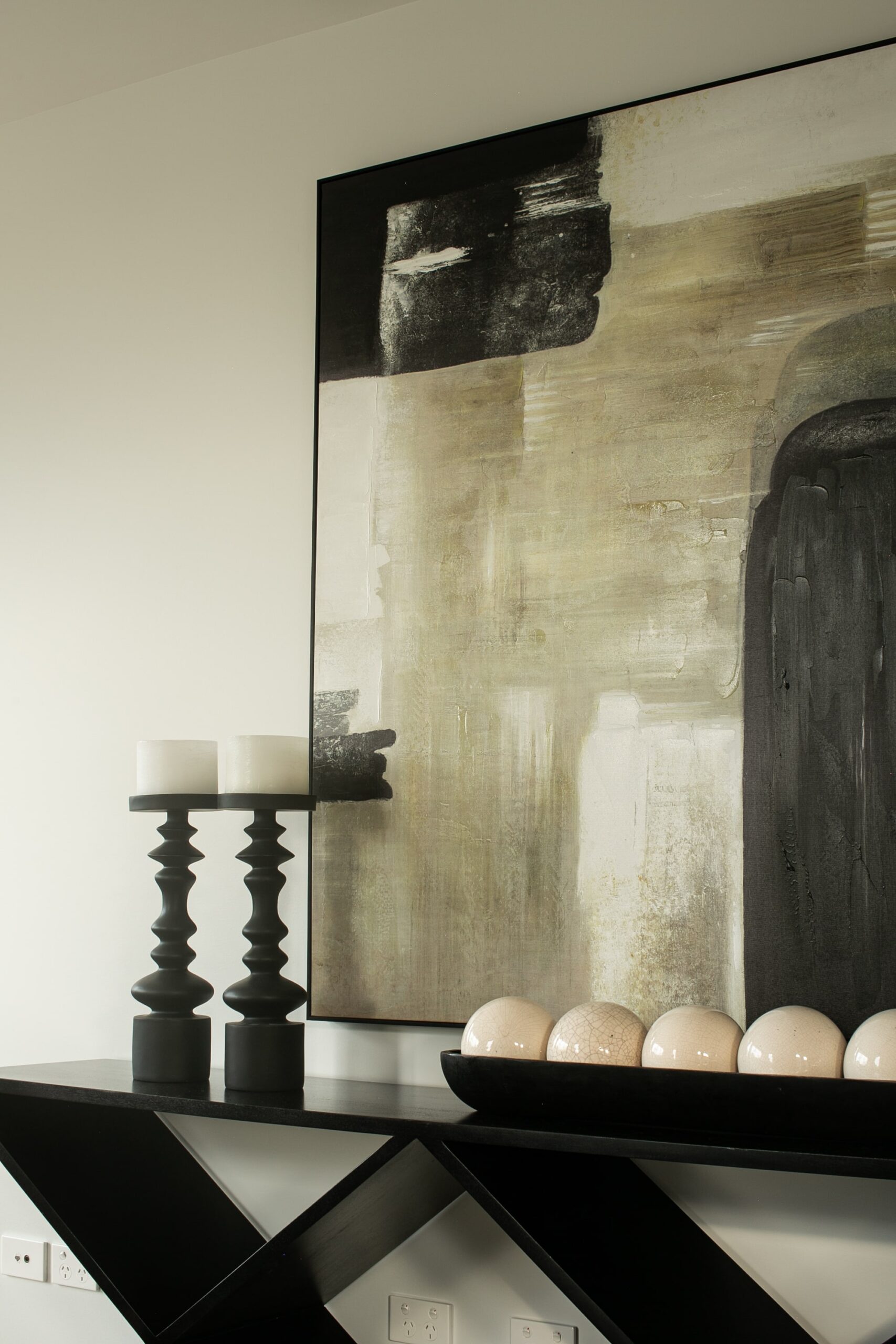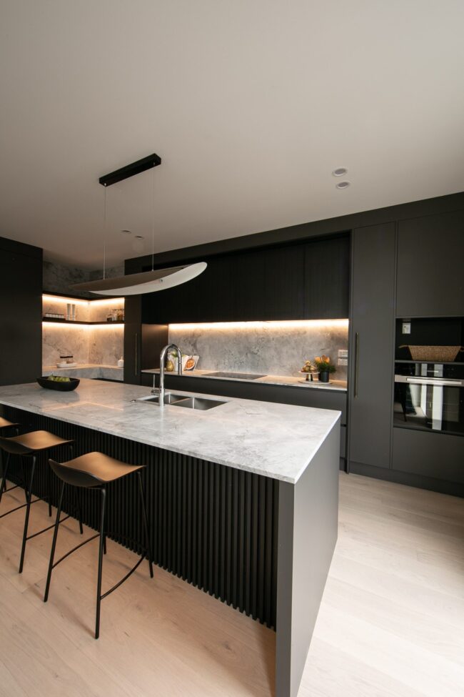The freestanding bath takes centre stage, sculptural in its simplicity. Positioned beneath the feature wall, it feels like a statement piece—inviting moments of pause and relaxation. The floating vanity continues the clean-lined approach, finished in a matte graphite tone and topped with marble. A vessel basin sits gracefully on top, paired with sleek wall-mounted tapware, blending contemporary functionality with refined elegance.