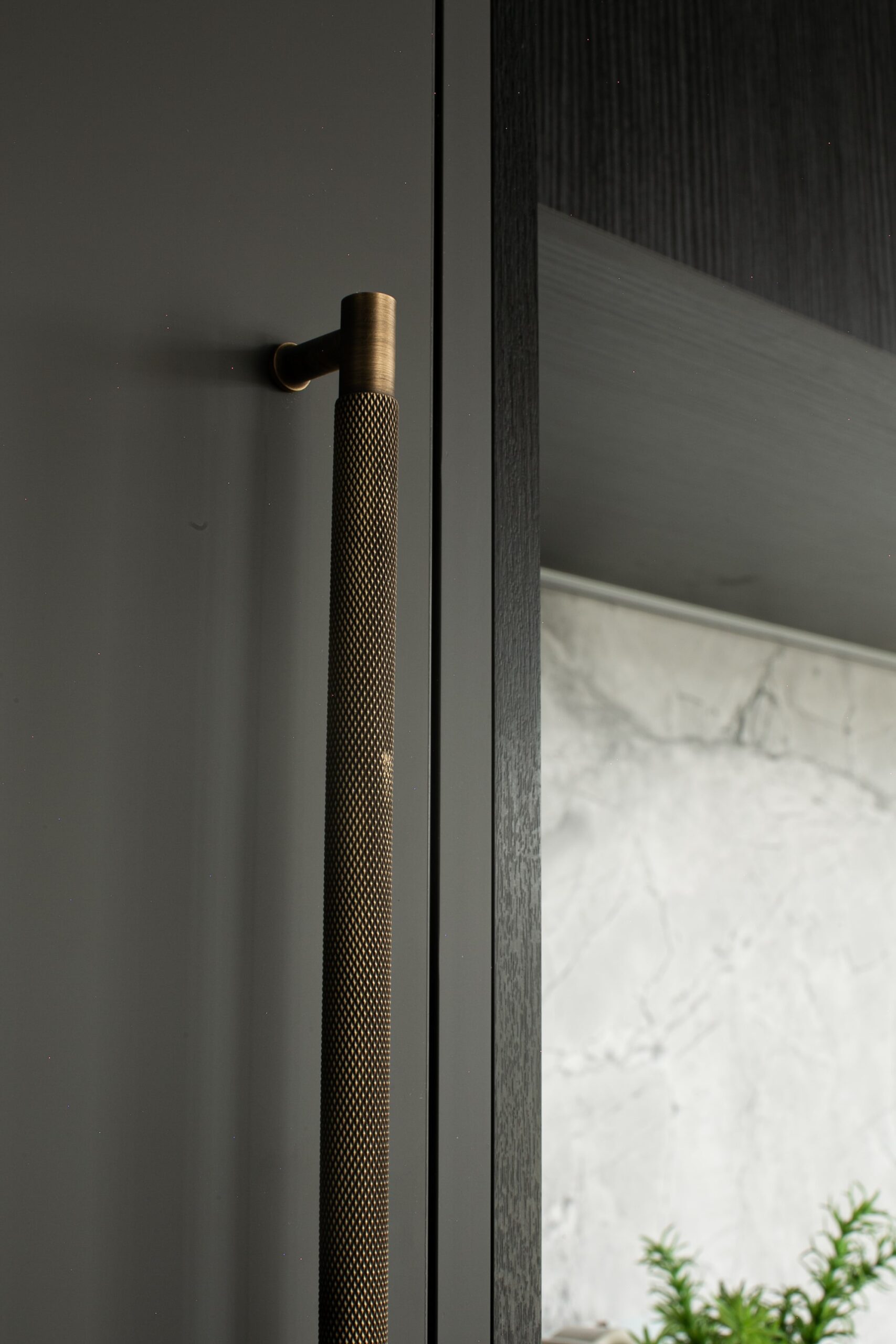 Natural light filters through the window, washing across stone textures and highlighting the interplay of dark and light surfaces. A simple vase with greenery softens the look, while polished details like the towel rail and mirror edge bring a touch of refinement. The design is both modern and calming—a bathroom crafted not only for everyday use, but for rituals of restoration and renewal.