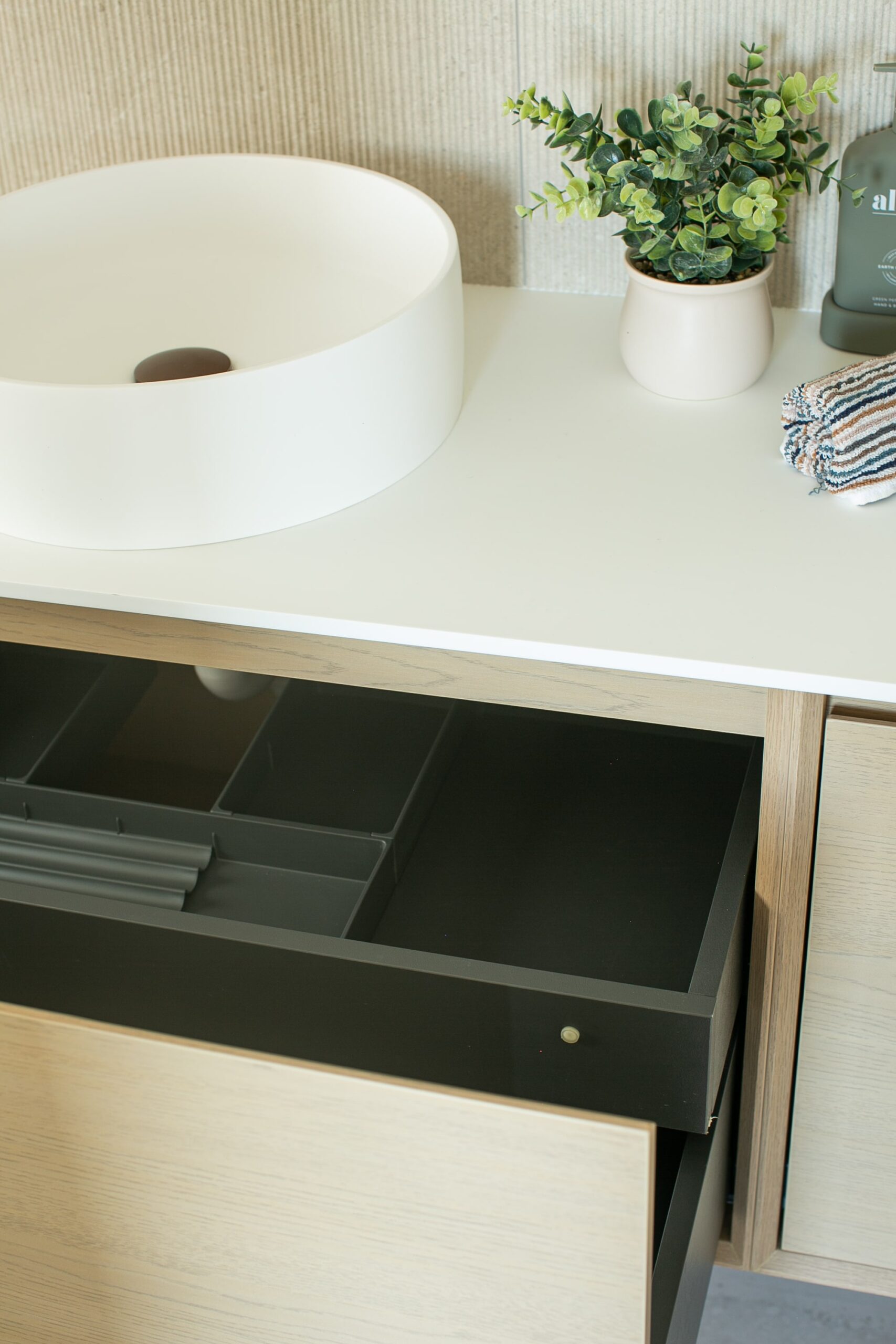Crafted from waterproof plywood, the light wood grain gently spreads across a matt finish. The wall-mounted design lifts it off the floor, shedding the bulkiness of traditional vanities while minimizing cleaning effort. Restrained lines harmonize with the organic rhythm of wood grain, tailored for small spaces craving lightness. Available in 450/600/750/900/1200mm widths with light-toned wood grains, it becomes a functional negative space on the wall. Laminated layers combat humidity quietly, while its unobtrusive storage logic harmonizes daily utility with understated aesthetics.